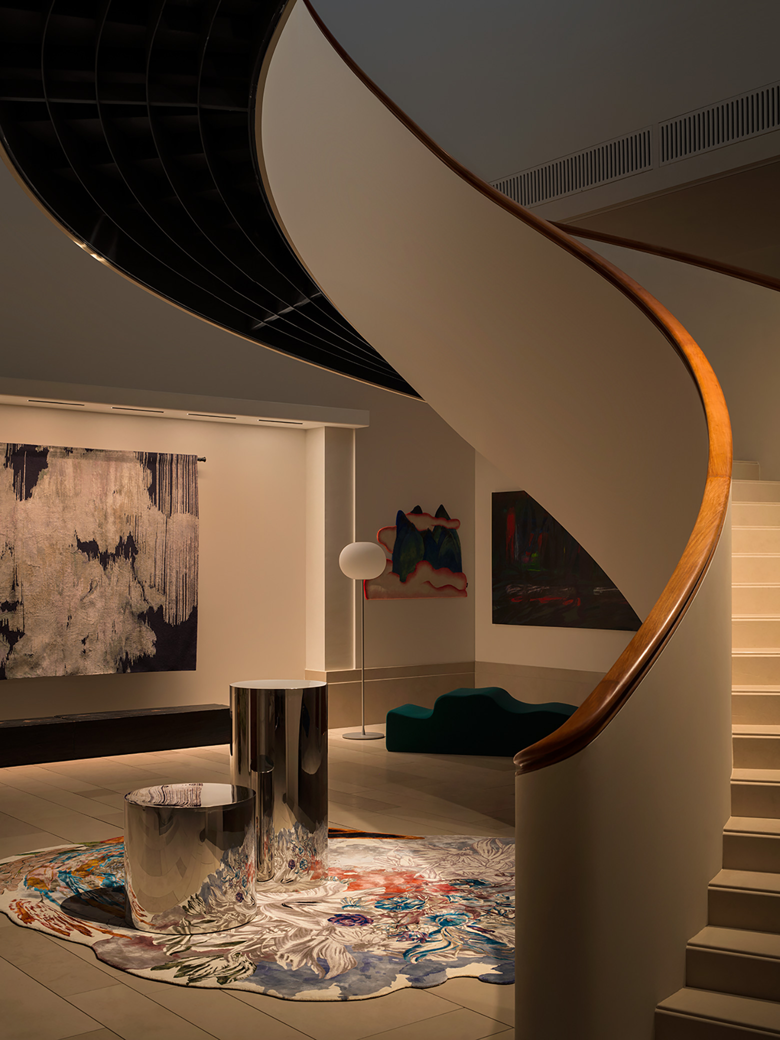 Rounding the spiral staircase, visitors instantly step into a floral realm envisioned by French designer Sam Baron. Having been exhibited in Milan, Paris, and Las Vegas, the art carpet Borealis from the Florae Folium collection now greets audiences at 8C Art Space. The designer employed paper, pencils, graphite, chalk, brushes, and color to create its pattern. The carpet appears to sprout like a surreal garden from the staircase's base. Its undulating forms, mirroring the spiral motion of the staircase, flow with a poetic rhythm. Its soft textures intertwine with the solid architectural structure of the staircase in the reflective surface of the stainless-steel posts, creating a hypnotic, dreamlike experience. Ascending the staircase, each step shifts the perspective—a dynamic journey intended by the curators, inviting visitors to become part of the spatial narrative.