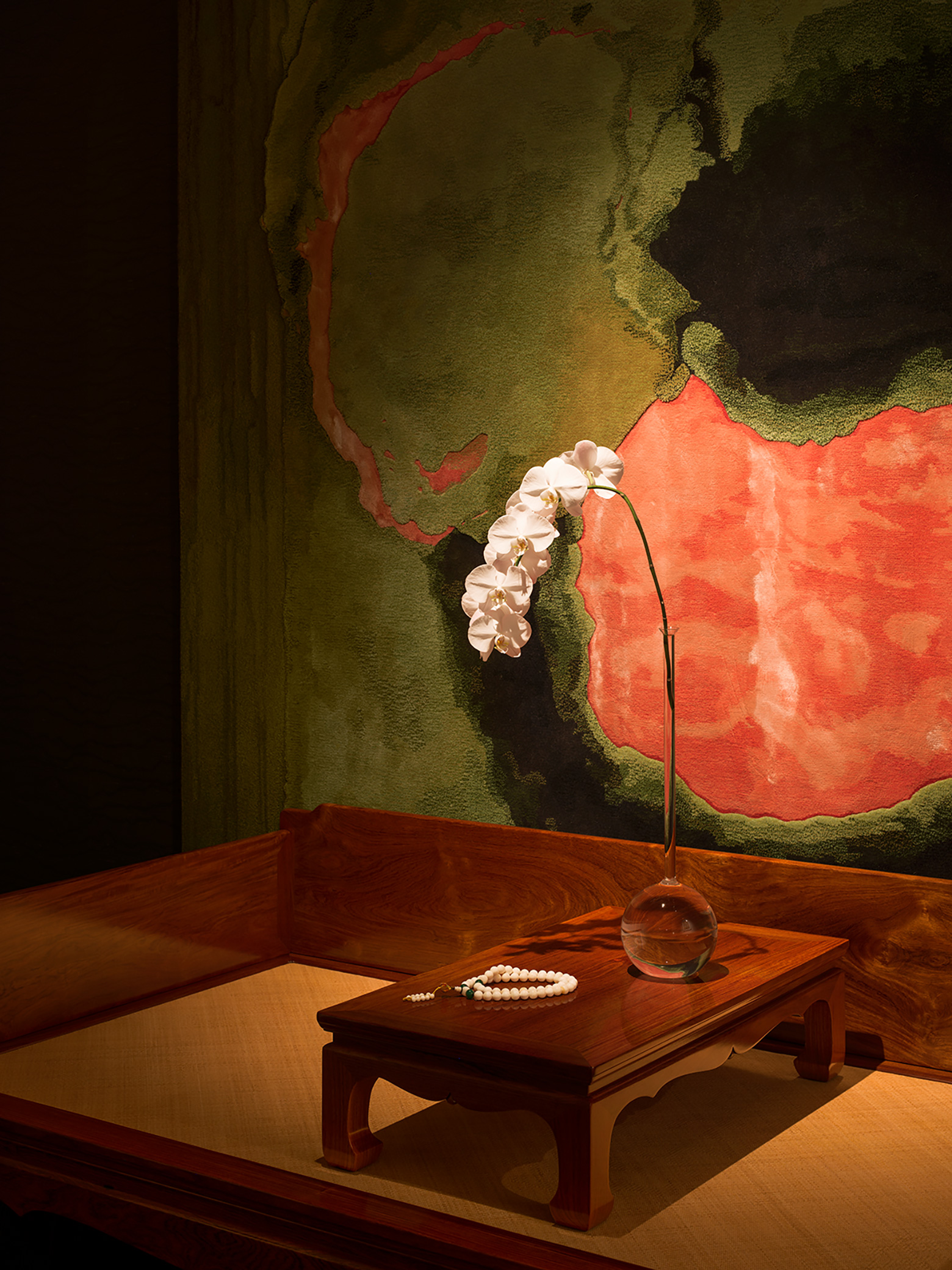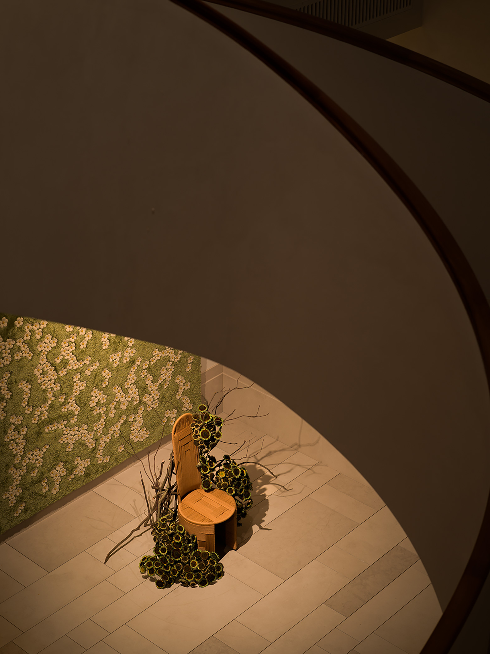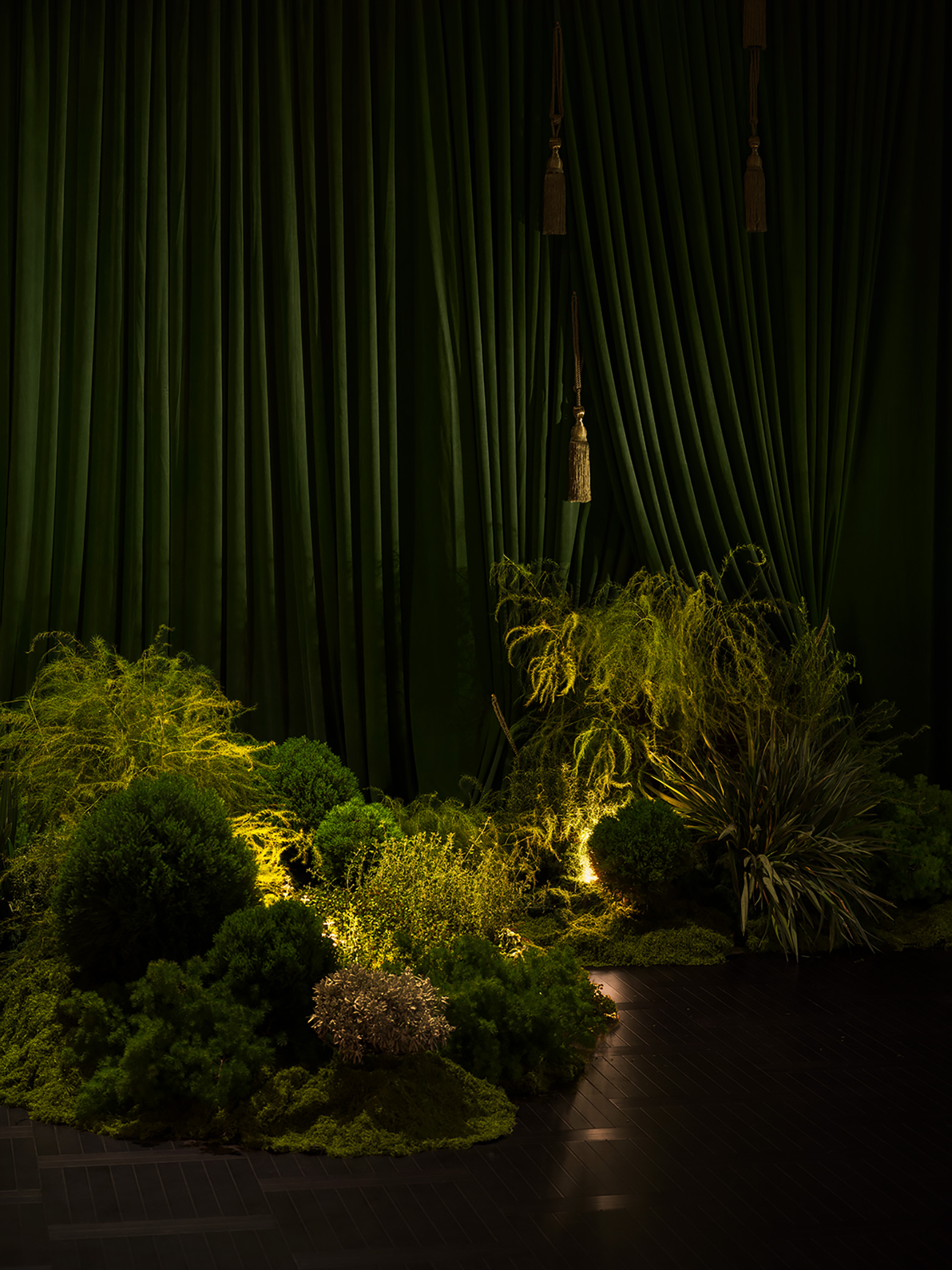 Green velvet covers the entire wall. The floral designer specifically chose plants with softly textured, spherical leaves and delicate ferns that spill out from beneath the drapery, suggesting an entire forest concealed behind, gently probing into the room. Pinpoints of light filter through the foliage like faint glimmers in a forest or flickering fireflies at night. Deep within this "forest" rests a Song-style couch. We invite visitors to sit down, allow themselves to be enveloped by the velvet's texture, the fresh plants, and the drifting light, and immerse fully in the present moment, becoming one with this tranquil, natural force.