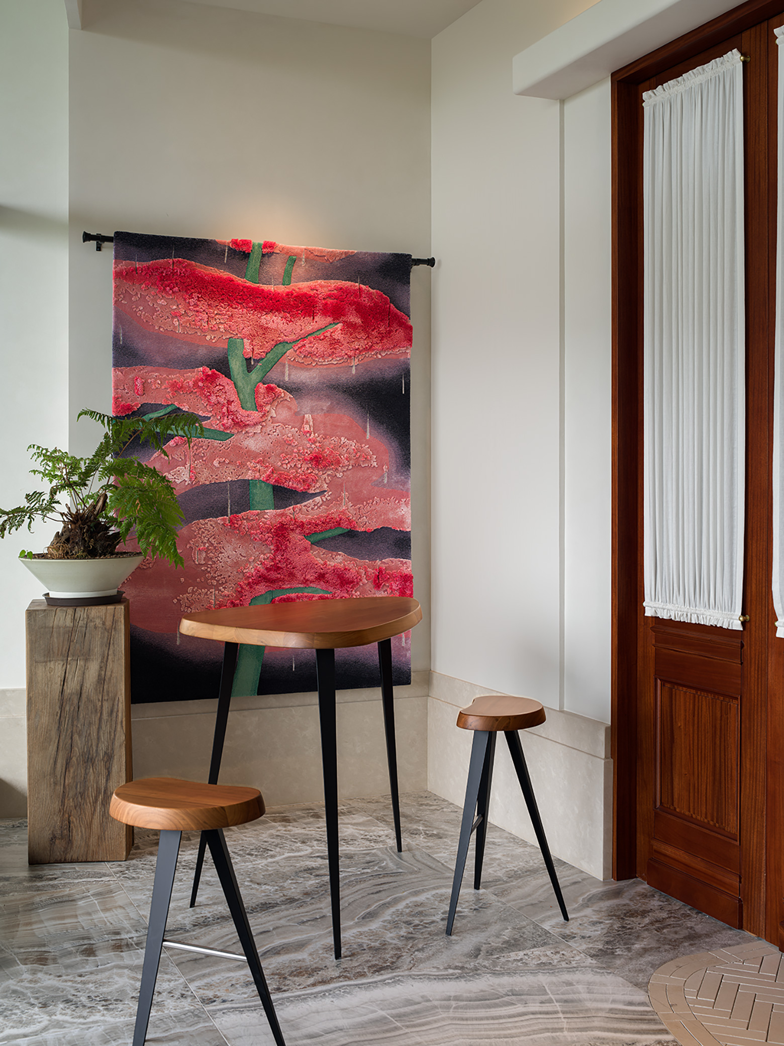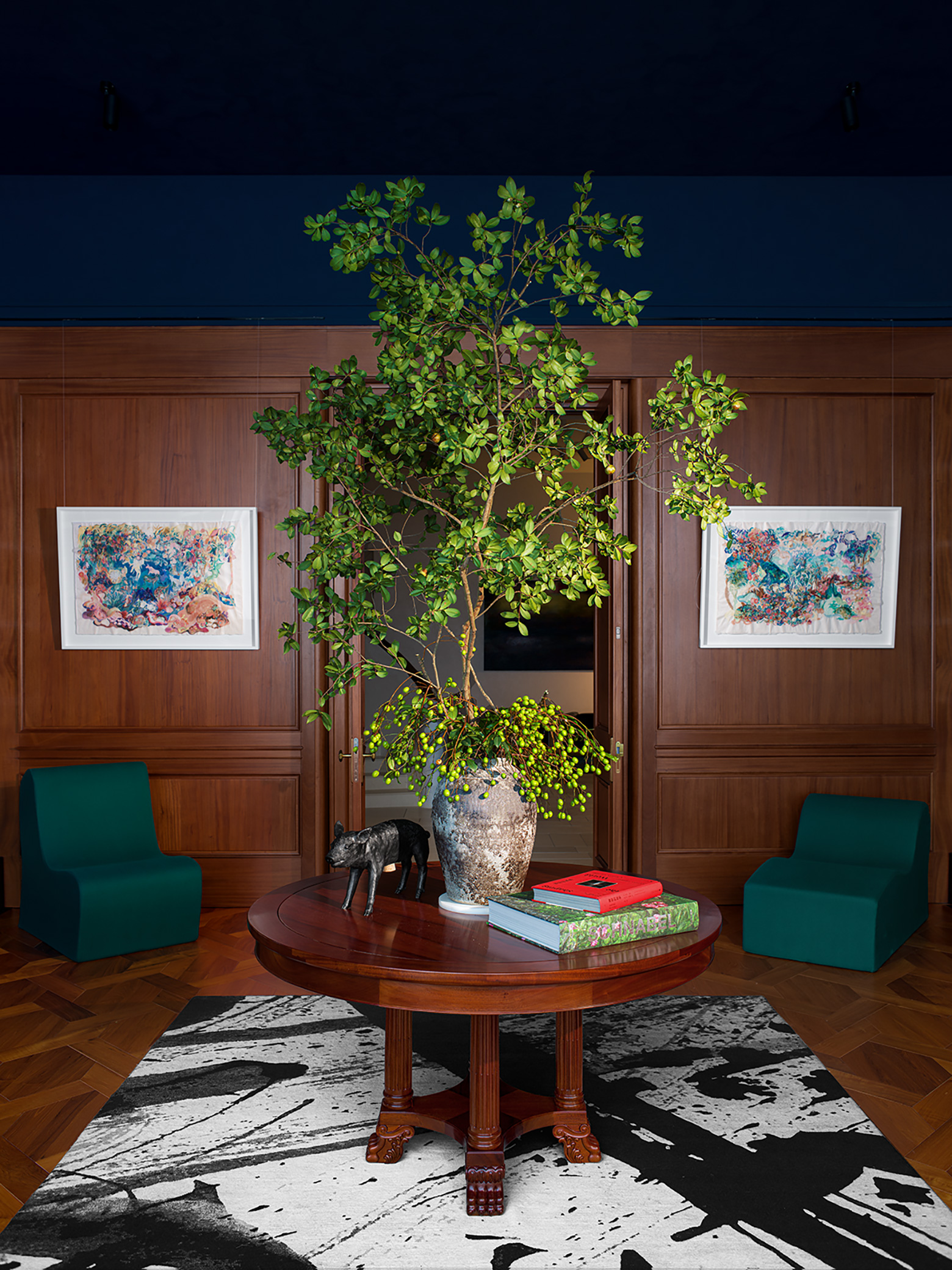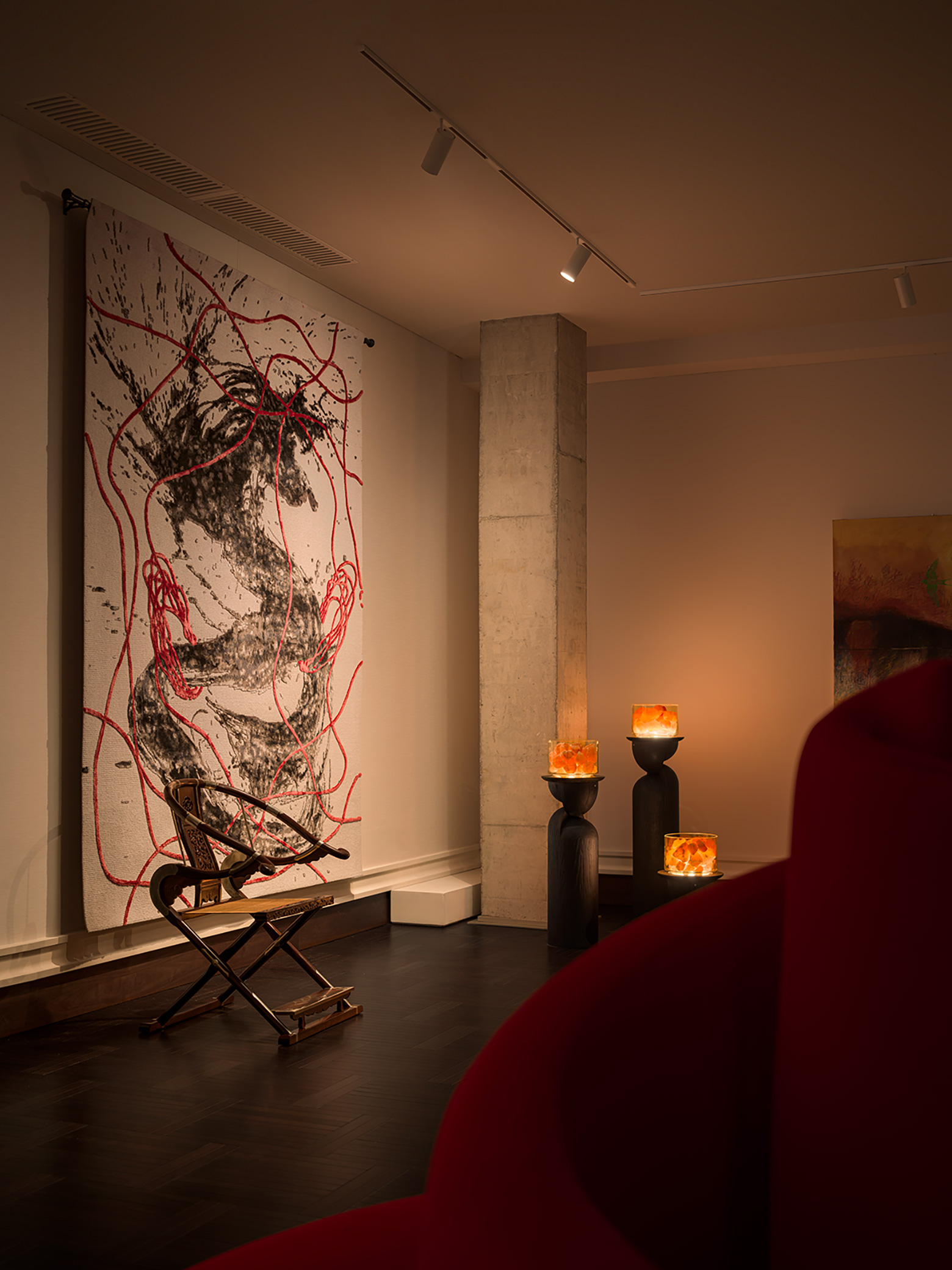 In the reading room, the rug designed by Zheng Yaqi is undoubtedly the soul of the space. Its unrestrained brushstrokes evoke a swirling blizzard or resilient roots hibernating beneath winter soil, gathering force to break through. Tea plants and Chinaberry trees on the table echo this, their botanical scent blending with the carpet's natural imagery. A mirrored composition is created by pairing the two green Malitte lounge pieces with Tamaris Borrelly's paintings Mineral and Magma respectively. This arrangement depicts the subterranean coalescence and flow of primal energy, making nature's immense, hidden forces visible. The entire arrangement narrates life's journey from dormancy to eruption.