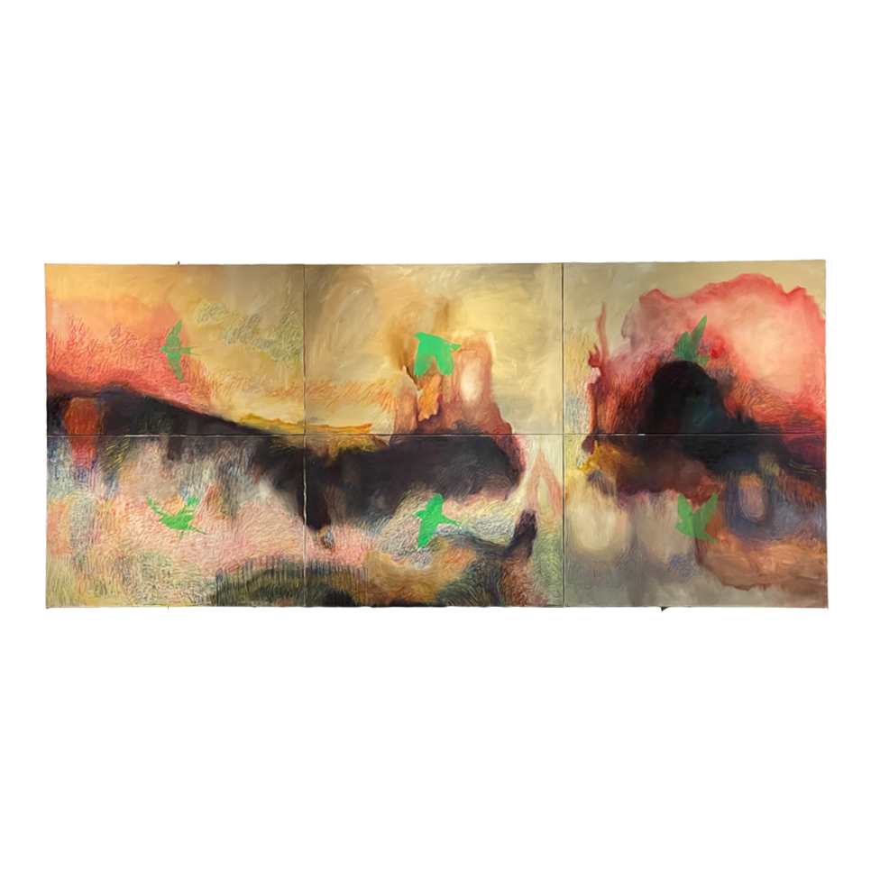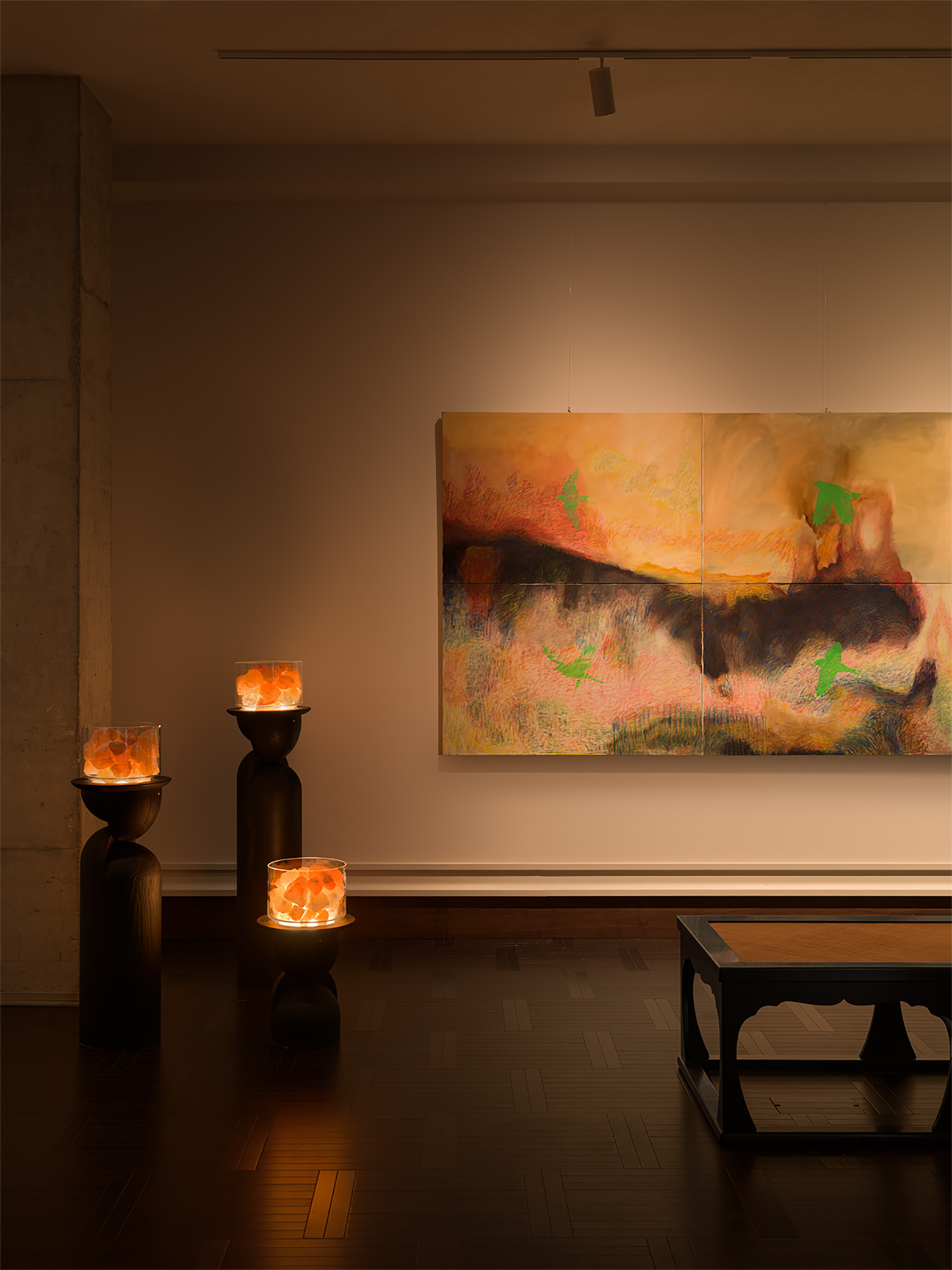 After journeying past coastlines, fields, flower meadows, and forests, visitors reach the exhibition's climax. A mighty dragon on the carpet Kunlun I (a TAI PING and Qin Feng collaboration) and a Qilin-carved antique folding armchair evoke a powerful mythological presence, signaling arrival in a realm inhabited by divine beasts. On the opposite wall, Zheng Yaqi's painting Flocks of Birds Sweep Through the Vast Sky 3 depicts birds soaring over mountain peaks. Here, we illuminate a "breathing" Himalayan salt stone lamp, inviting visitors to unwind with aromatic essential oils and embrace a moment of peaceful coexistence with themselves.