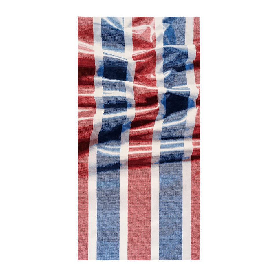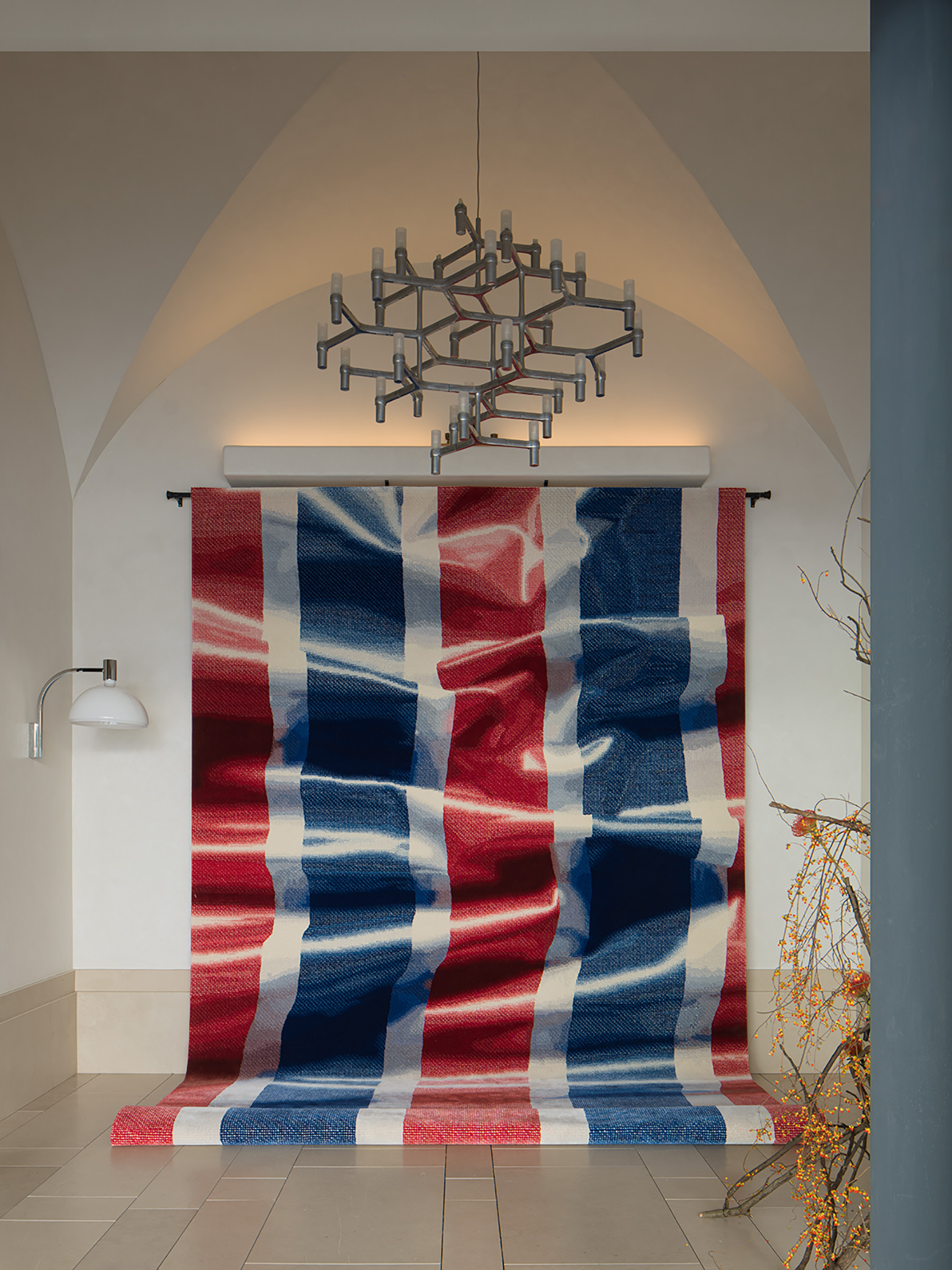 △At the exhibition entrance hangs the carpet Hong Kong Walk On I, with a pattern created by artist Stanley Wong (also known as anothermountainman). The piece pays tribute to the iconic crumpled red-white-blue canvas, celebrating Hong Kong's cultural identity. This work was previously featured at Art Basel Hong Kong 2022.