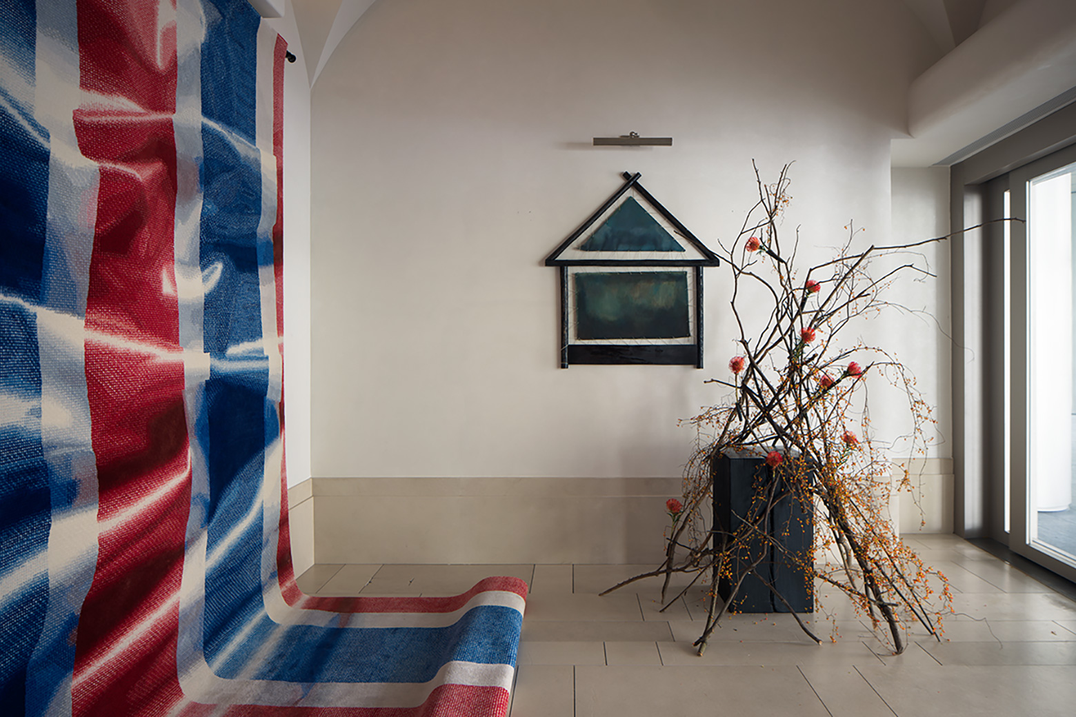 At the exhibition entrance, on the left, hangs the carpet Hong Kong Walk On I by Hong Kong artist Stanley Wong (also known as anothermountainman). Its inspiration stems from the iconic red, white, and blue plastic canvas ubiquitous in Hong Kong's streetscapes during the 1960s and 70s – a signature element in his work. This inexpensive material was commonly used for carrying goods, covering construction sites, and as awnings for market stalls. The artist employs this deeply ingrained cultural memory to reflect urban transformation and convey the resilient spirit of Hong Kong people. On the wall is Zheng Yaqi's work Perception of Wildness 1. A floral installation in the corner, featuring dark branches and bittersweet, embodies the untamed vitality of nature. This arrangement creates a potent metaphor: on one side, a carpet imbued with urban memory; on the other, succinct contemporary art and floral design. It suggests that even within the concrete city, nature finds crevices to penetrate, persist, and grow. The presence of visitors, in turn, injects the freshest vitality into this very space.
