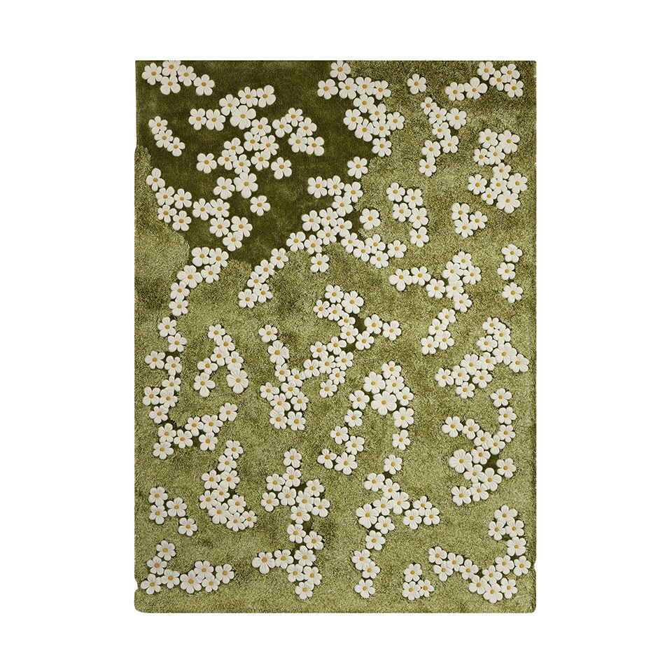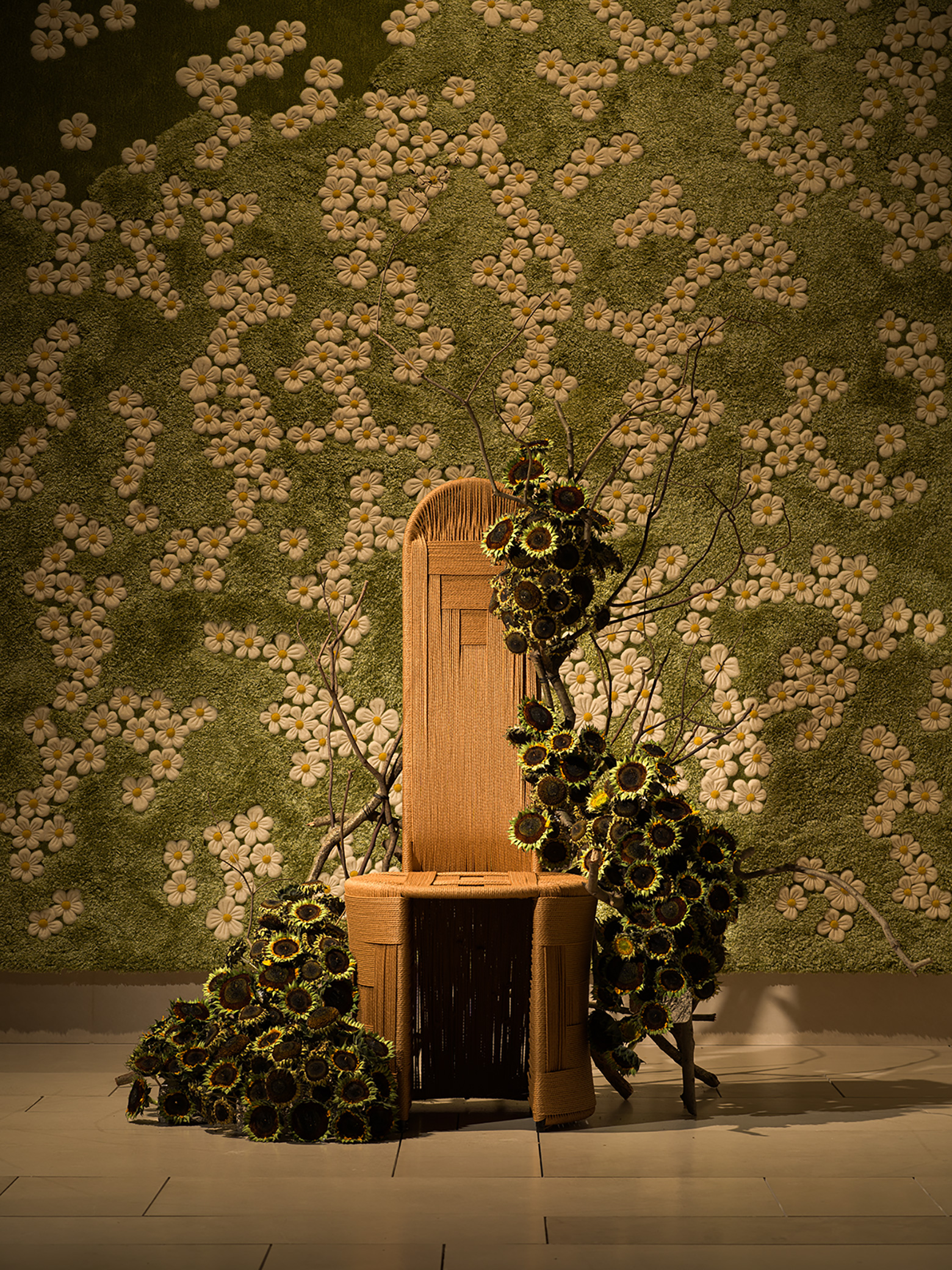 This field woven by TAI PING's handmade carpets radiates a fresh, vibrant energy. Up close, its unique carving technique gives each "daisy" a distinct, three-dimensional texture. Before it, the Miss Rope Chair engages in a dialogue with the carpet's delicate weave through its entirely hand-woven rope craftsmanship. The floral designer's clever touch lies in the sunflowers with their petals removed, leaving only full seed heads—like blank canvases inviting viewers to ignite them with golden light through imagination. The brightness of the field in your mind directly mirrors the brilliance of the scene here.