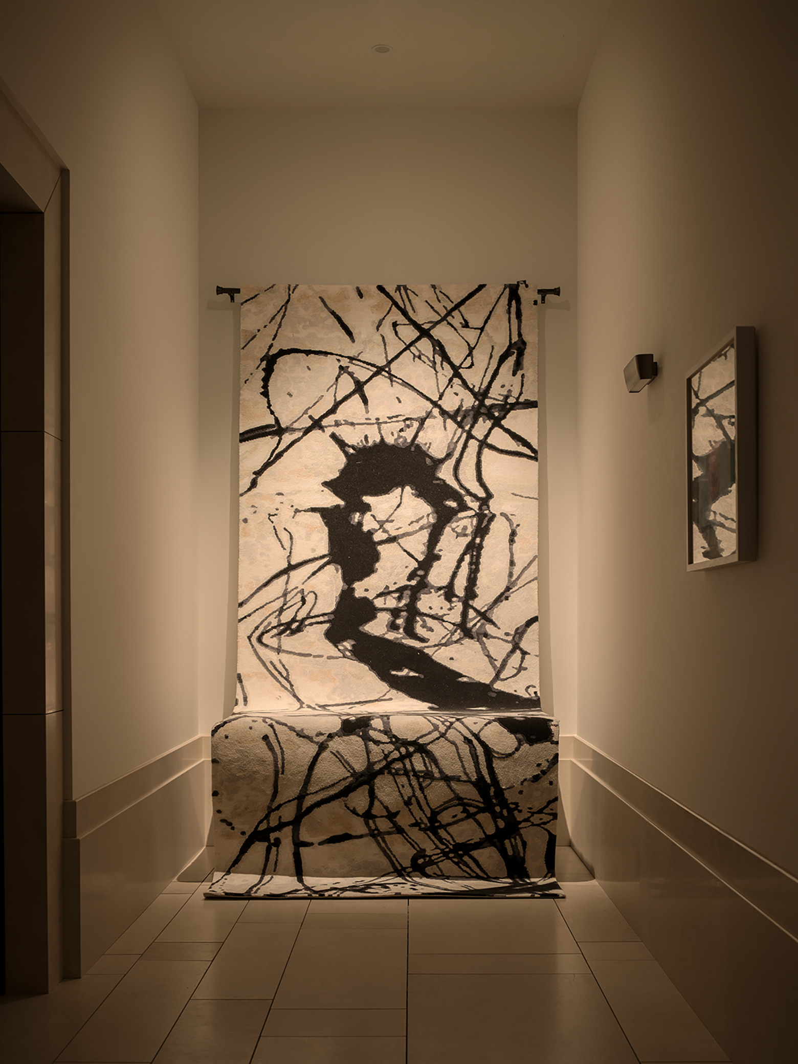 △Ground Floor Passageway. The carpet exuding an Eastern aesthetic and winter ambiance is Jiuqu I, created by artist Qin Feng. Dominated by black and white, it resembles an ink wash painting. With vigorous and unconstrained brushstrokes, the artist portrays the mighty Yellow River. The entire carpet evokes a sense of water cascading from a height or resilient branches, brimming with tenacious vitality.
