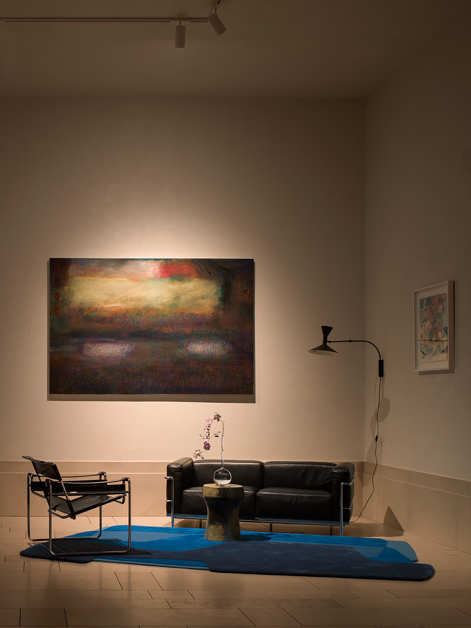 8C excels at juxtaposing design artifacts from different eras and regions. Here, the painting The Unanticipated Summer Night by young artist Zheng Yaqi and Paysage Rose by French artist Tamaris Borrelly reflect each other. The former evokes a moonlit sky over a deep ocean, conveying a profound mood. The latter presents a field in full bloom, its radiant colors illuminating the heavens. Each painting captures an eternal moment, illustrating the concept that "a single flower embodies a whole world." A sofa and a carpet are placed here. The latter's design inspiration stems from global travels. Three classic black designs – the Wassily Chair, LC3 two-seater sofa, and Lampe de Marseille wall light – enrich the dialogue between design and art. The entire area resembles a suspended moment where sea and sky converge; sitting in different spots and gazing in various directions offers distinctly unique experiences.