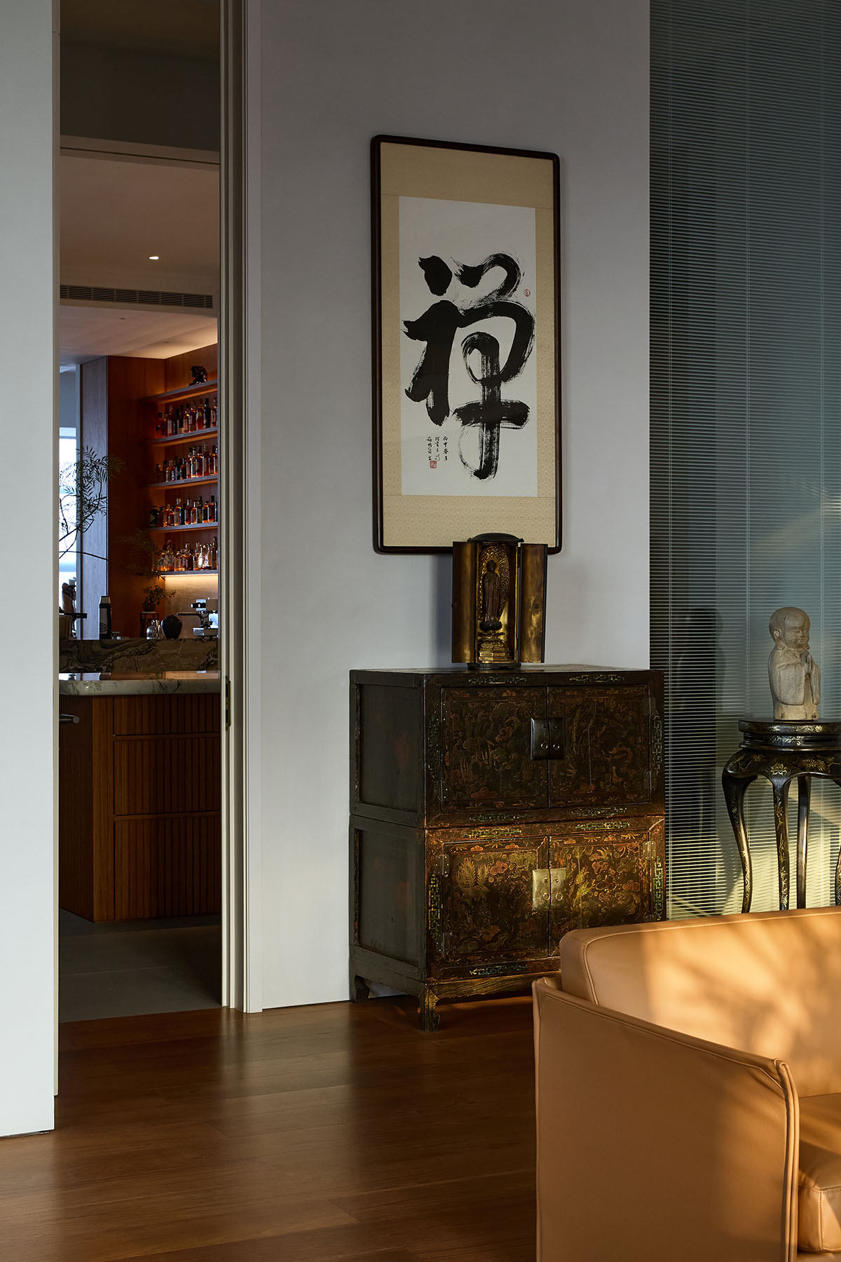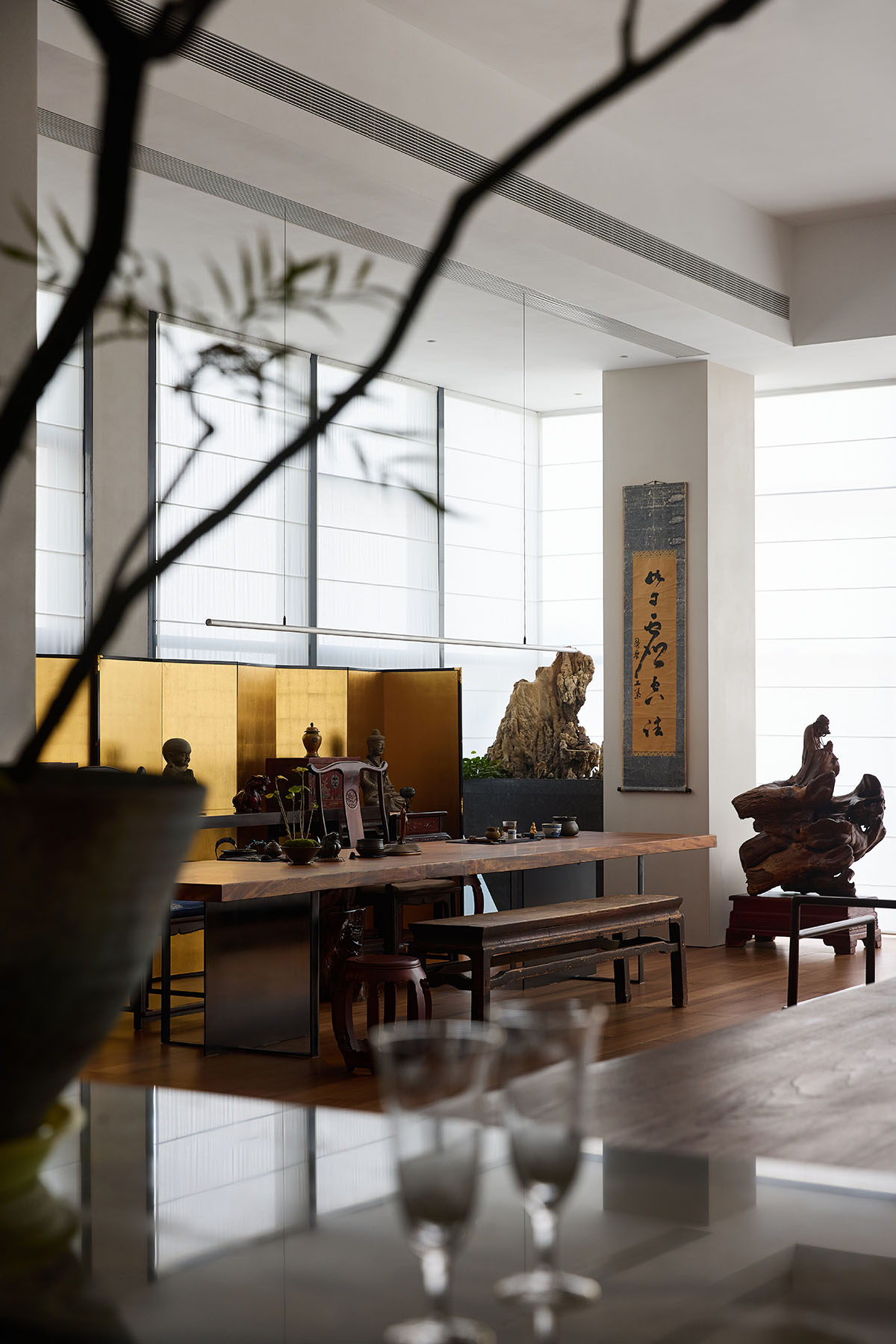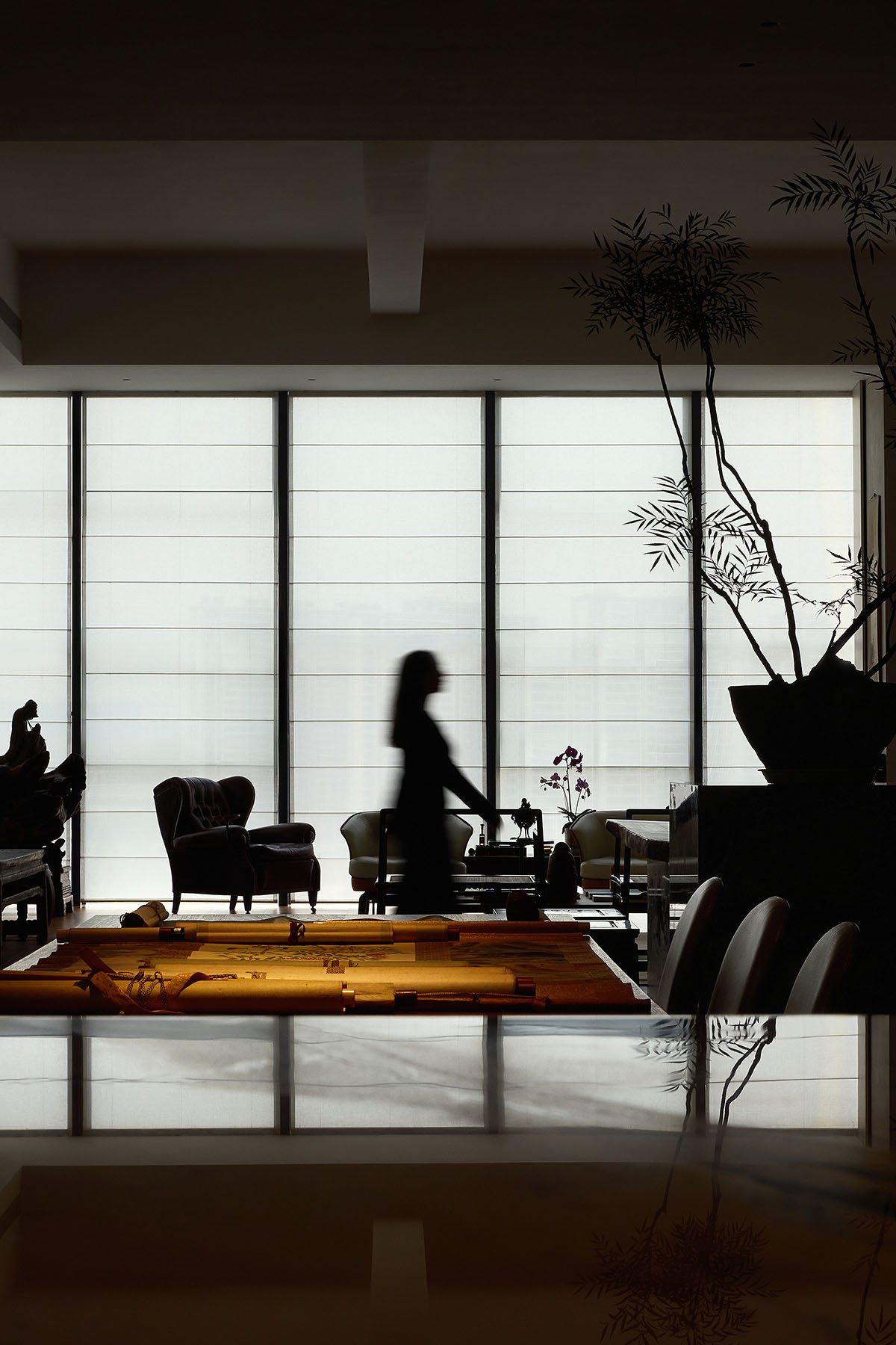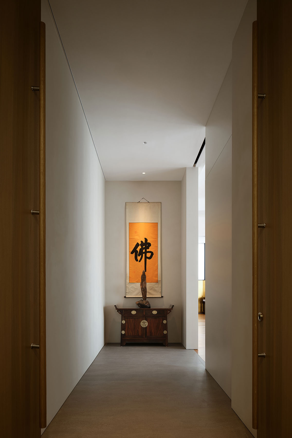 In the north corridor, the character “佛” (Buddha) resonates with the character “禅” (Zen) in the owner’s private space. Buddhism teaches that “the Middle Way is to be apart from extremes,” and throughout the space, the designer reveals a profound understanding of this Middle Way and the philosophy of balance. Here, one can experience the confluence of modern space and traditional culture, the interwoven horizontal and vertical circulation with the rhythmic alternation of expansive and intimate areas, the fusion of light and qi (energy), and a dialogue between Eastern and Western design. One can experience the interplay of calligraphy and painting, the blending of tea and wine, finding both solitude in stillness and companionship in activity, where the boundaries between work and life dissolve yet remain distinct. It is not merely a physical space but a spiritual sanctuary. The designer deftly balances opposing forces, seeking harmony through contrast, achieving unity through diversity, and ultimately, through an immersive experience, bringing a sense of equanimity, comfort, and serenity to the individual.