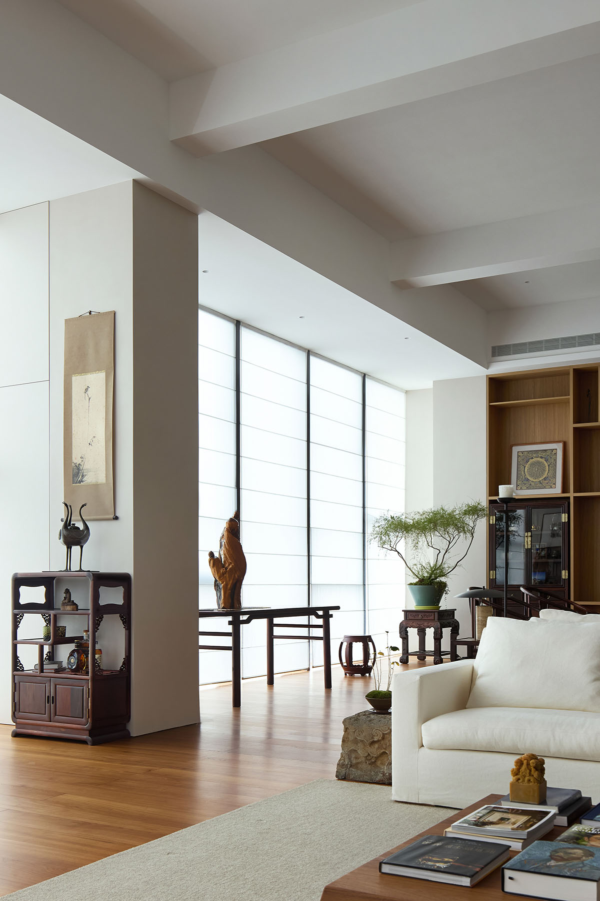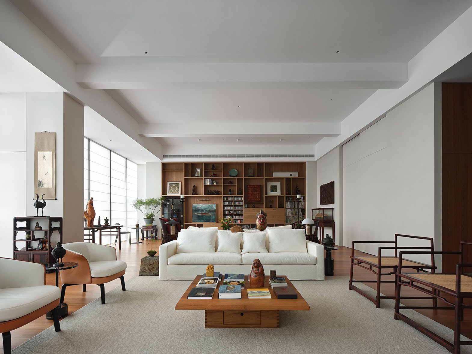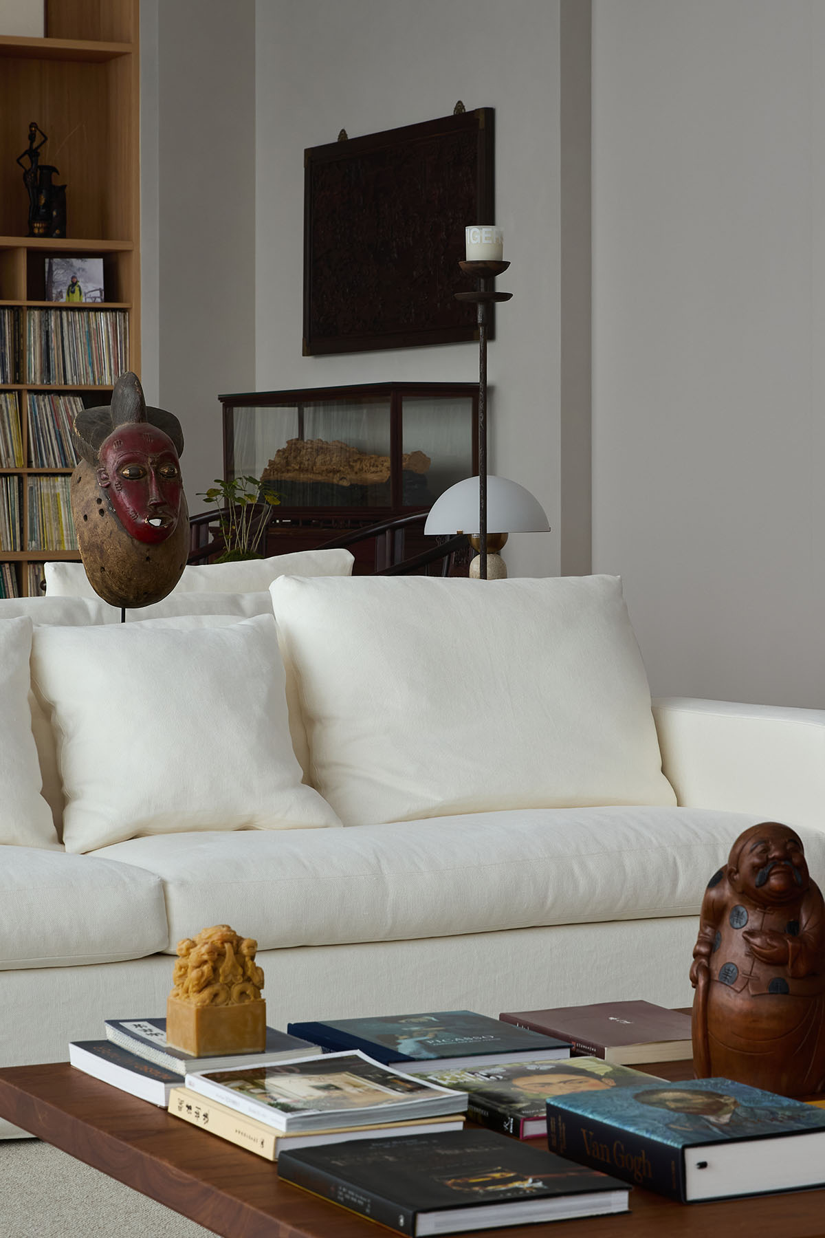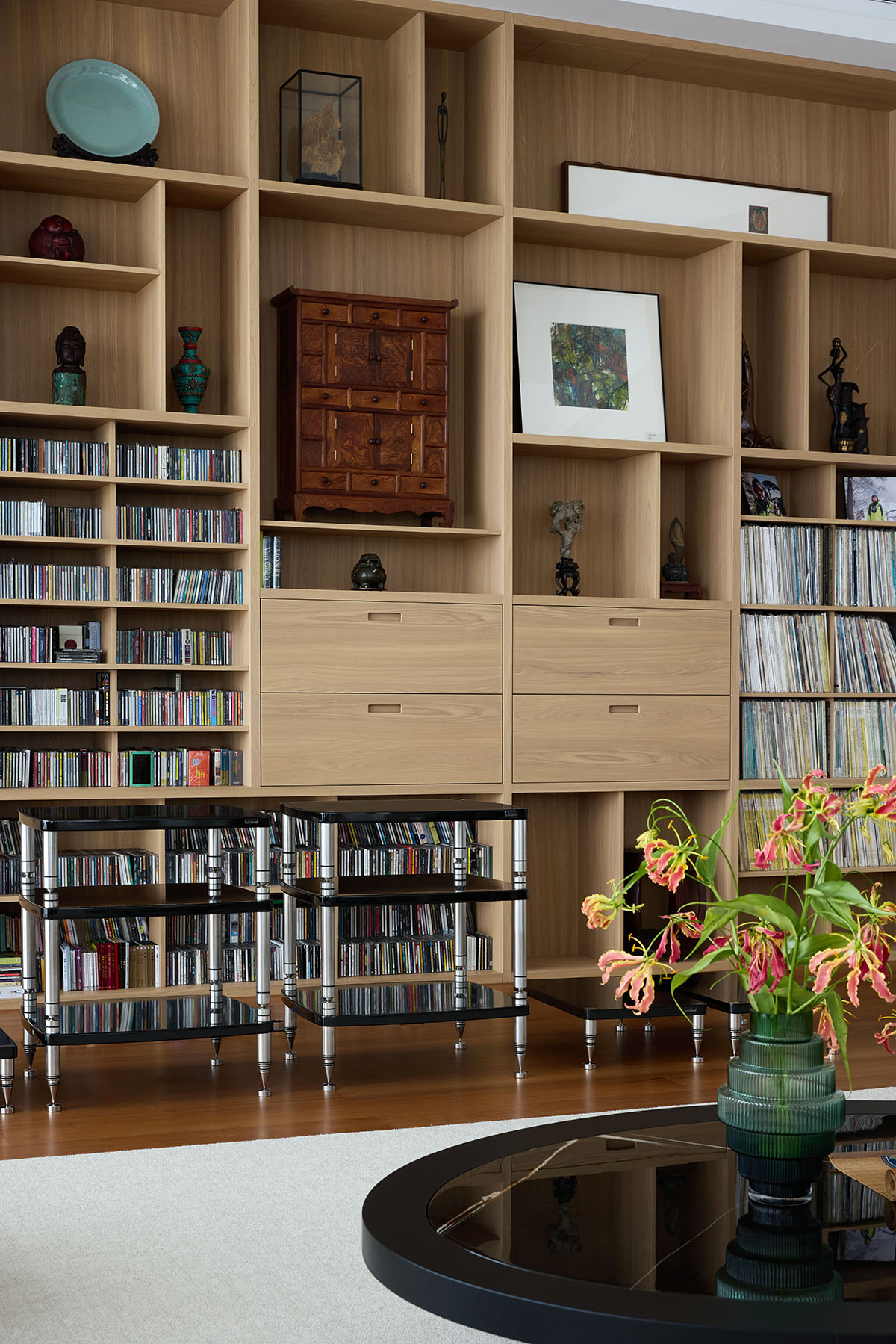 A central challenge and defining highlight of this project is that over 90% of the items originate from the owner’s private collection. These range from Ming and Qing dynasty rosewood furniture to Western modern pieces, high-fidelity audio equipment alongside a curated vinyl collection, and ancient painted scrolls alongside various artifacts and wood carvings. The designer, through comprehensive and multifaceted consideration, sensitively discerned the relationships between these objects—their materials, forms, and heights—ensuring each achieved its optimal position. Simultaneously, the designer unearthed the inherent potential of each item, revealing its versatility: the dining table serves not only for meals but also as a surface for painting and practicing calligraphy. This flexible deployment of objects allows the space to remain in a state of perpetual incompleteness – it enables it to be regenerative. The result is a space versatile enough to be a salon for exploring cinema, vinyl, and art; a living space for entertaining friends with tea and wine; a gathering place for appreciating calligraphy and painting; and a sanctuary for both business and solitude.