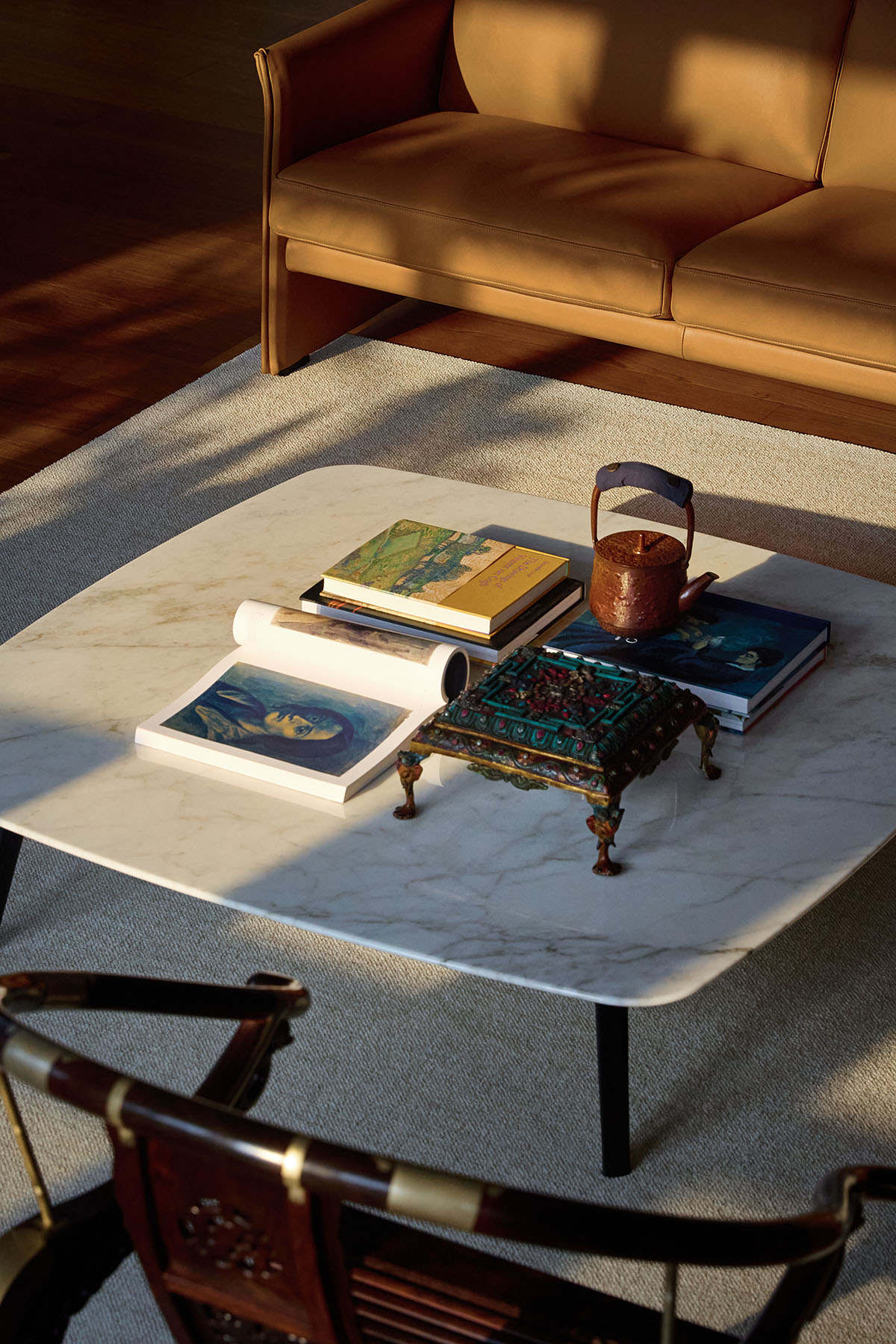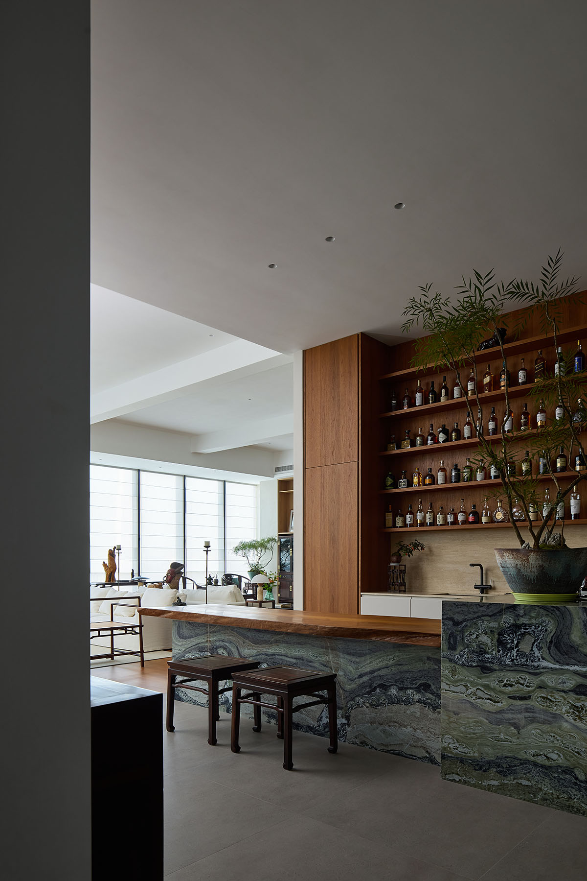 Expansive floor-to-ceiling windows allow the designer to maximize natural light, which, combined with varying shades of wood, creates a bright and welcoming atmosphere. Teak, elm, jade green marble, and genuine leather intertwine, bestowing a sense of breath and life upon the space. In the main reception room, Taihu stones and a gnarled root carving evoke the ambiance of a tea ceremony in a breezy outdoor courtyard. In the bar area, teak wine racks line the wall, while marble and teak compose the countertop. Crisp lines lend sharpness to the wood’s warmth, while the subtle jade hue and fluid ink-wash patterns soften the marble’s weightiness. Ultimately, the patina of time accumulated by the objects, the natural aura emanating from the materials, the spirit of conviviality, and the space’s adaptable energy converge to create an atmosphere conducive to well-being—a revitalizing energy that flows back towards the individual.